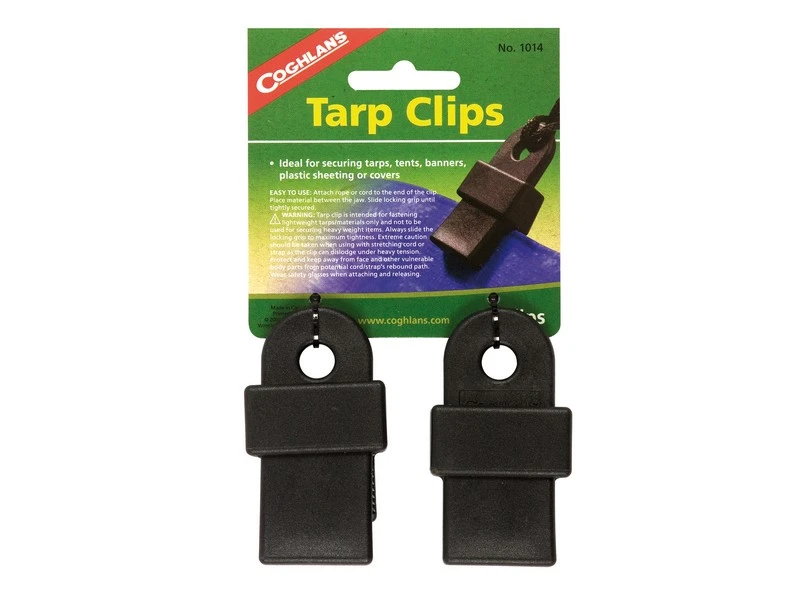 Stevige clips. Voor het vastzetten van een tenttapijt, een tarp, een afdekzeil, een grondzeil etc. De klemmen zijn snel en eenvoudig te bevestigen zonder beschadigingen. Door het oog van de clip kan een touw of haring worden bevestigd om de clip vast te zetten.