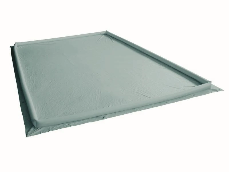 Ideaal waterdicht grondzeil van PVC materiaal voorzien van afzonderlijk opblaasbare randen. Deze randen vormen een dam tegen het water dat van buitenaf naar binnen wil komen en beschermt de tent tevens tegen wind en kou. Het grondzeil is voorzien van bevestiging ogenjes om het grondzeil goed vast te zetten.